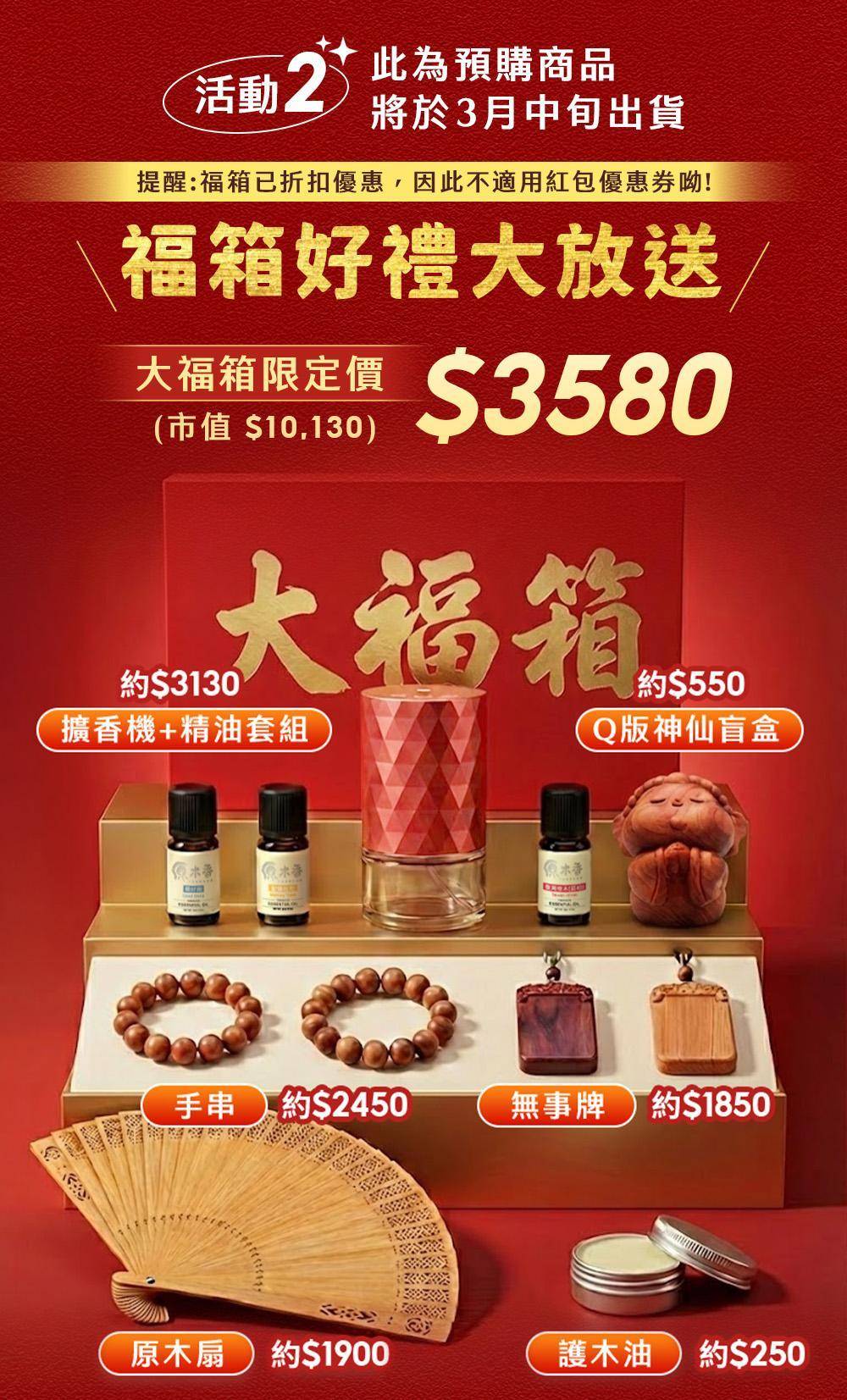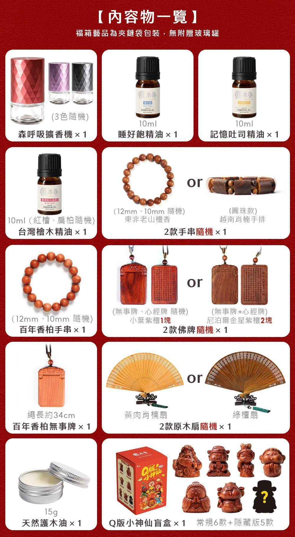 【預購】原木香 2026春節活動福箱 【免運】價值萬元招財香氣大放送 招財香 招財藝品 招財手串 招財精油 招財原木公仔 隱藏版盲盒公仔 擴香機 無事牌 護木油 保養套組 原木扇子