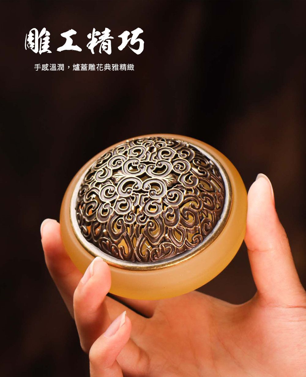爐蓋採精緻鏤空雕刻工藝,線條婉轉如雲如水,