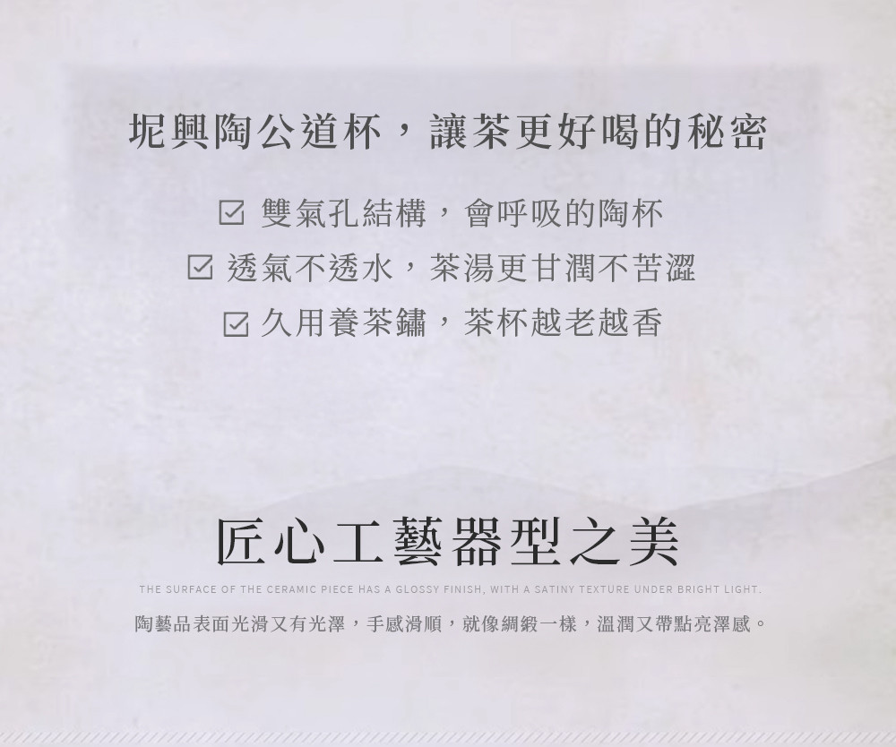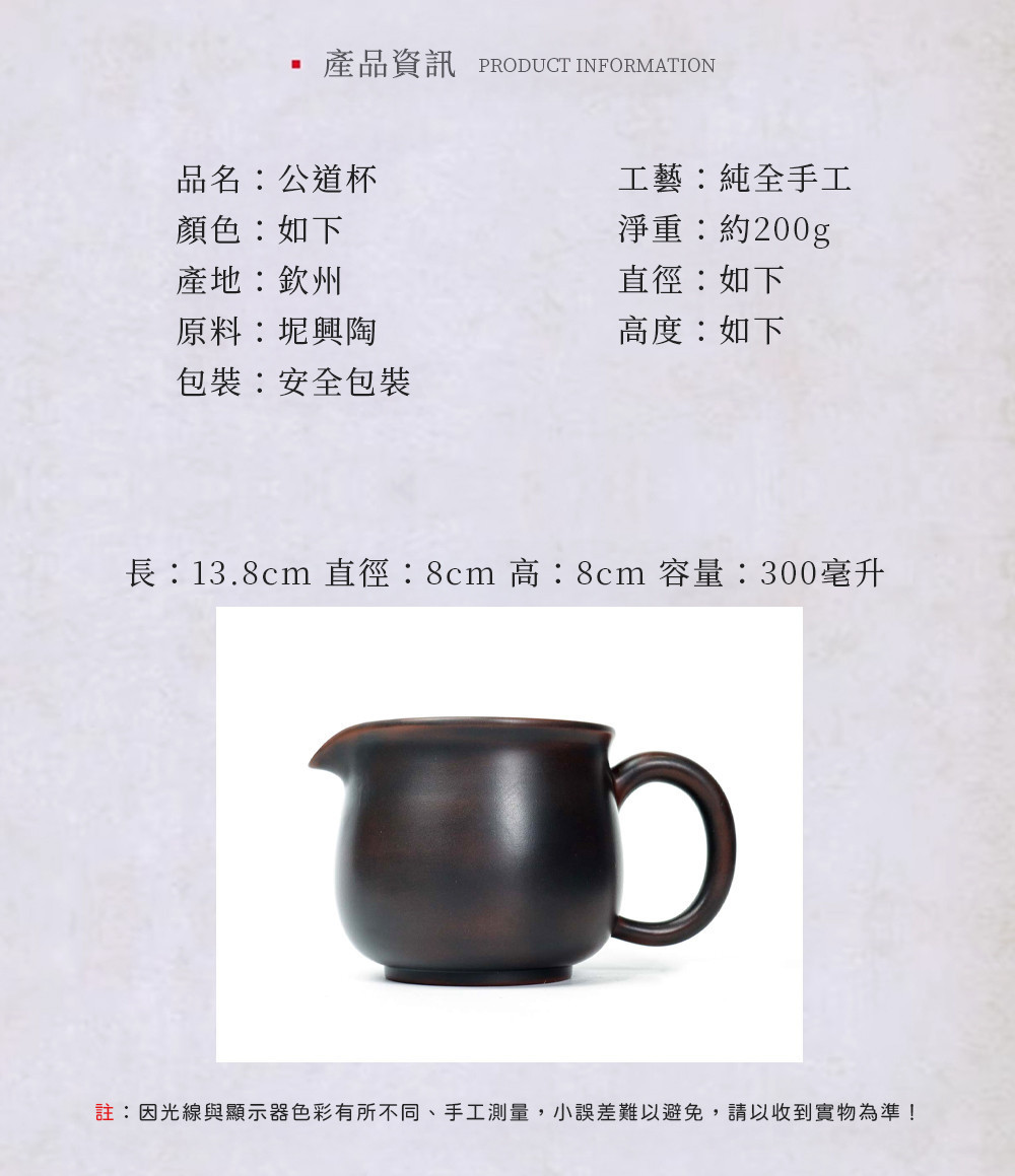 產品規格【產品名稱】坭興陶 公道杯【產品材質】坭興陶【產品規格】長13.8cm,直徑8cm*高8cm【產品重量】約200g【容量】 約300ml【工藝】純手工註:因光線與顯示器色彩有所不同、手工測量,小誤差難以避免,請以收到實物為準。