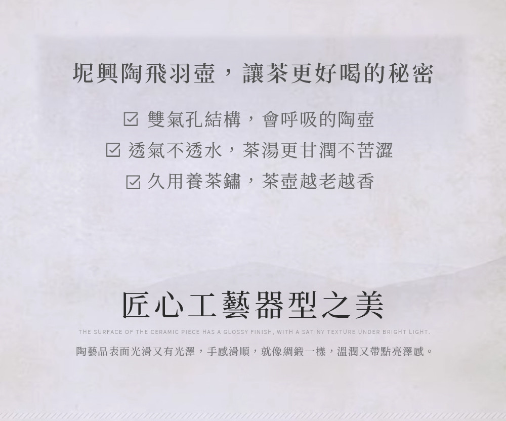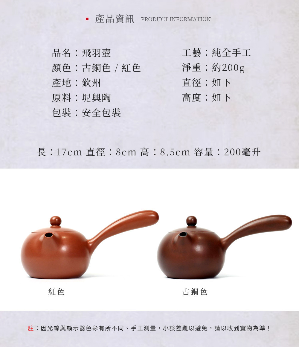 產品規格【產品名稱】坭興陶 飛羽壺【產品材質】坭興陶【產品顏色】古銅色 / 紅色【產品規格】長17cm,直徑8cm*高8.5cm【產品重量】約200g【容量】 約200ml【工藝】純手工註:因光線與顯示器色彩有所不同、手工測量,小誤差難以避免,請以收到實物為準。