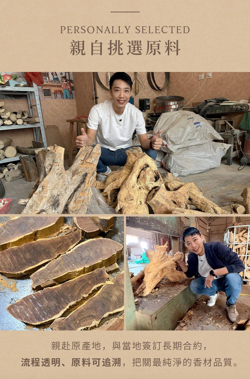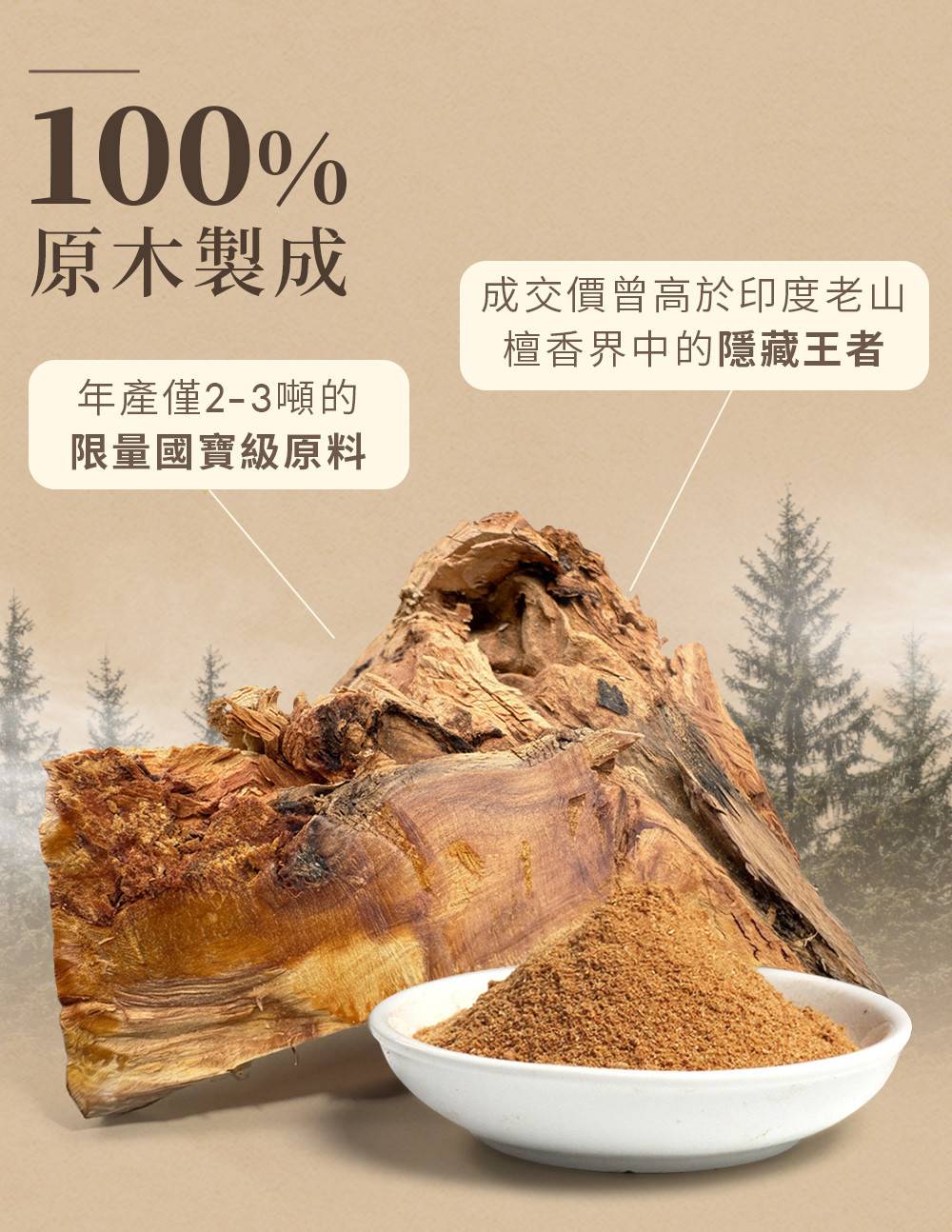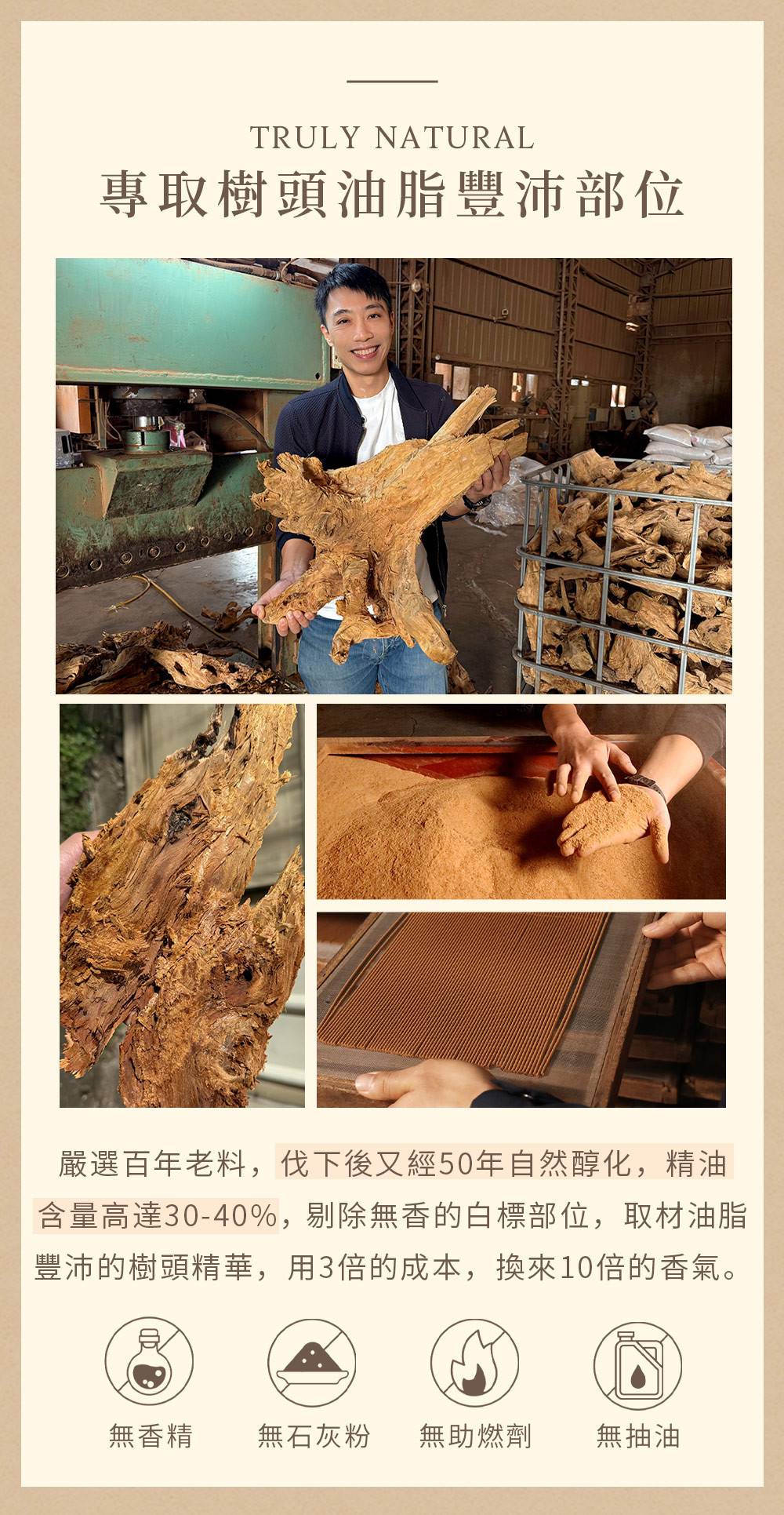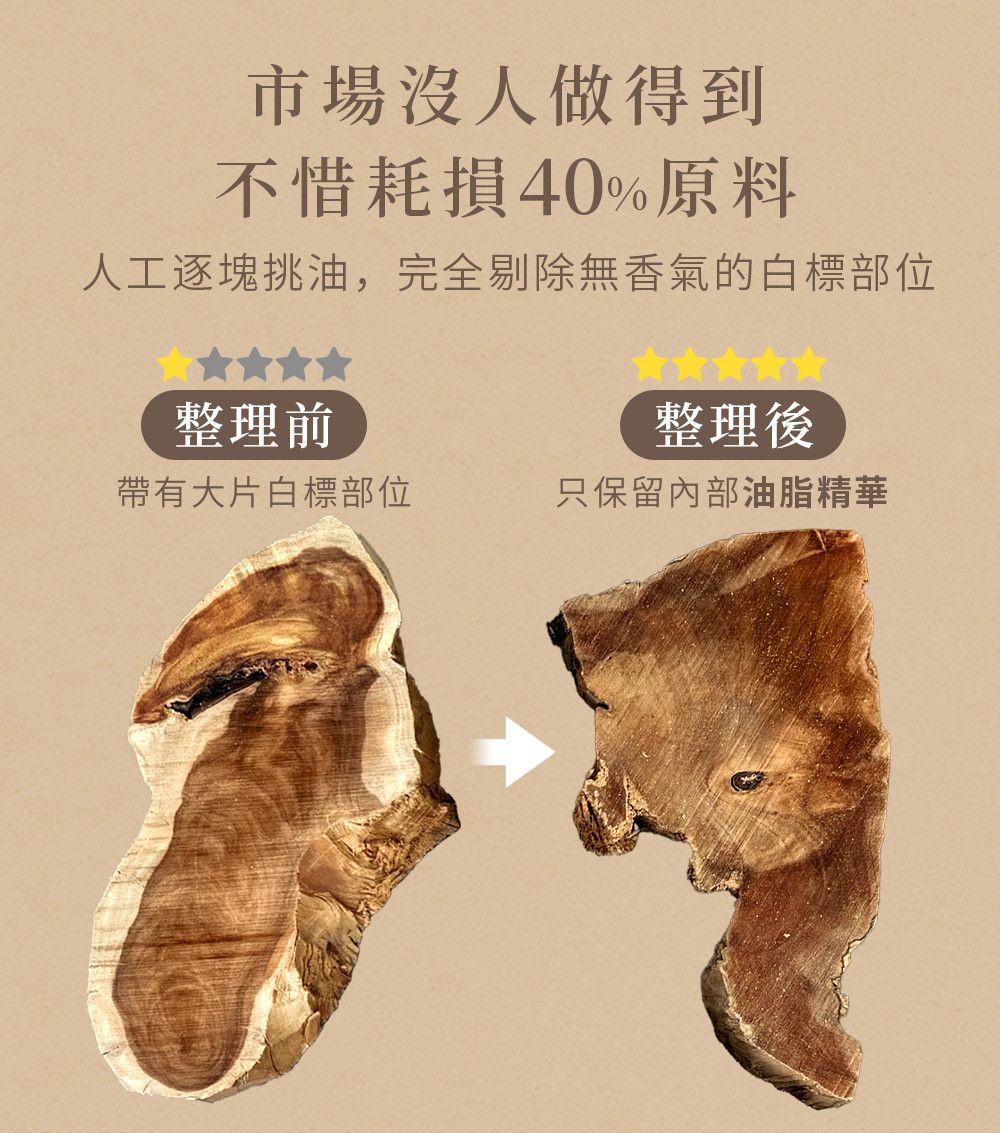 ✔ 精選百年以上的老樹頭料,油脂濃厚、香氣最純