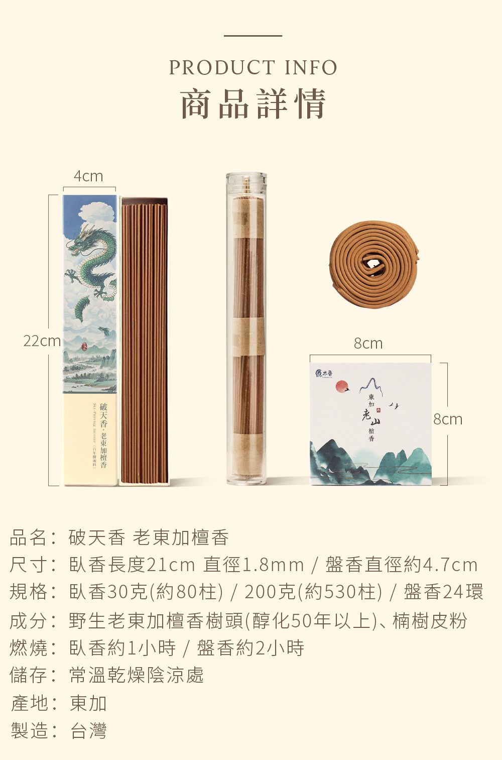 商品名稱|破天香.老東加檀香臥香、小盤香