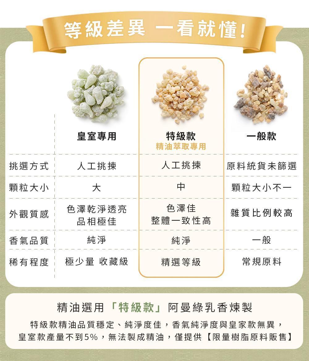 來自阿曼產區的綠乳香,香氣清透、乾淨,帶有淡淡檸檬與森林松針氣息。① 阿曼綠乳香精油名稱|阿曼綠乳香精油規格|10ml原料|阿曼綠乳香香氣特色|綠乳香帶有清透的樹脂香氣氣味乾淨、微帶檸檬感整體香氣清爽而不厚重② 綠乳香調和精油名稱|寧靜時刻規格|10ml原料|阿曼綠乳香50%原料|佛手柑原料|真正薰衣草原料|甜橙香氣特色|以阿曼綠乳香為基底交織佛手柑與甜橙的清新柑橘氣息讓空間帶有沉靜又清爽的氣味商品特色✔ 親赴產區與產農合作,取得第一手萃取出來的精油✔ 不做後製添加,用蒸餾萃取,展現出完整的香氣細節✔ 省下中盤與通路的成本,能用更實在的價格買到品質可靠的精油使用方式.一般擴香機加水後,滴入3~5滴精油使用.純精油擴香機可直接滴入精油使用.可滴於香氛石或木片,置於床頭、書桌、車內老闆真心話其實很多人對乳香的印象,都會覺得味道比較厚、比較老派一點。但綠乳香不太一樣,它的香氣會更清透,聞起來帶一點檸檬的清新感,還有一點像森林裡松針那種乾淨的味道,不是那種很濃、很重的乳香,反而是乾乾淨淨、很舒服的那種香氣。像聖經在《舊約》裡有提到一個很有名的故事,耶穌誕生的時候,東方三賢士帶來三樣禮物:黃金、乳香、沒藥。乳香在那個時候,其實就是一種獻給神的香氣,象徵很崇高、很神聖的存在。但它也不只是故事而已,像阿曼乳香,其實一直都是高級香氛跟保養市場很重視的原料,尤其綠乳香這一支,真的蠻厲害的。它的香氣非常乾淨,聞起來清爽、有層次,又帶一點點那種神聖感的氣息。平常日常聞香其實就很適合,如果你有自己的儀式時間,像是放鬆、冥想、靜一下的時候更加推薦,是一支很乾淨、很好記住味道的入門款。