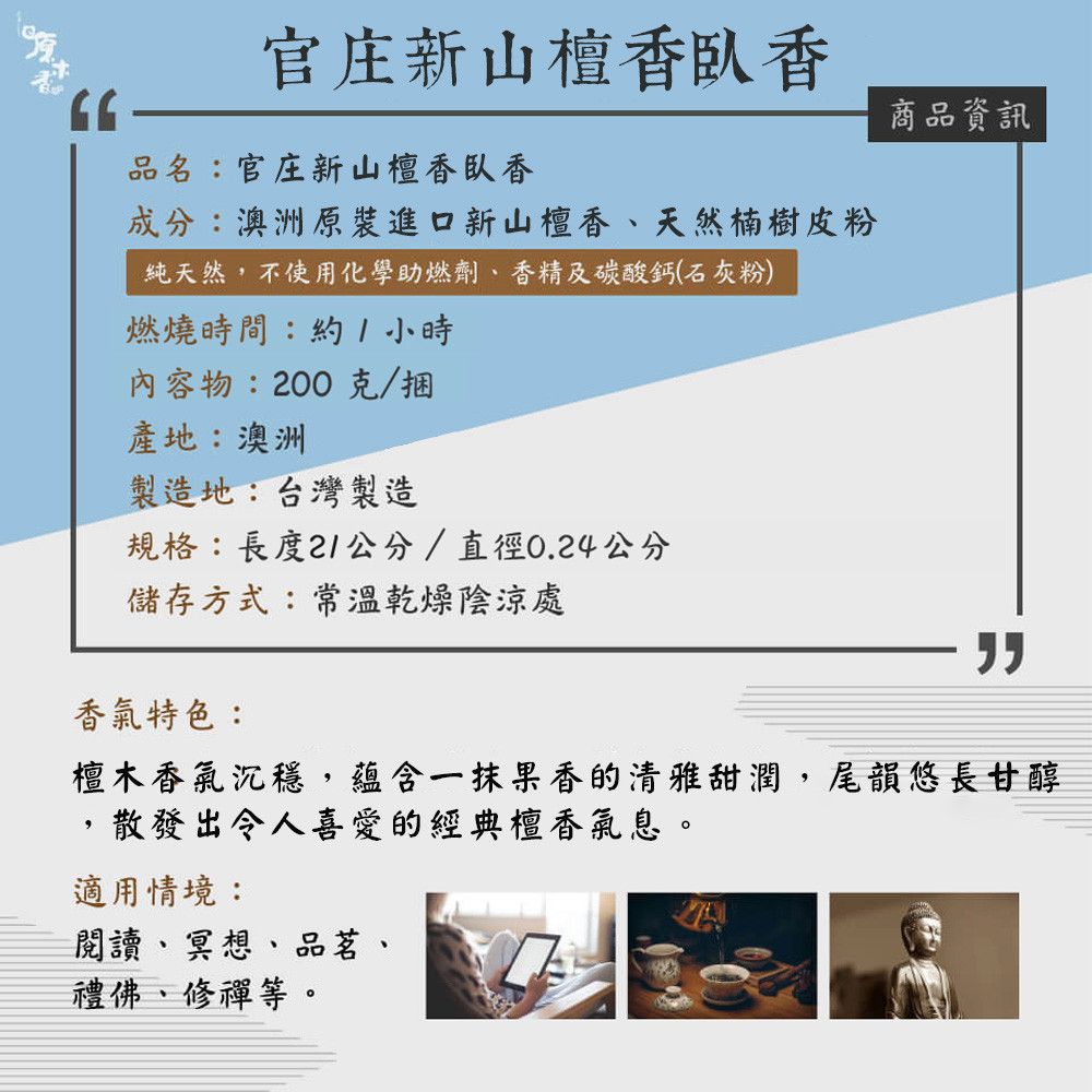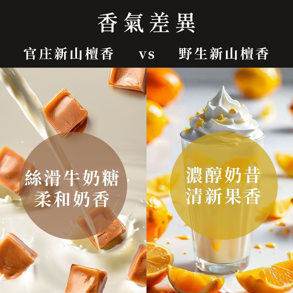 商品名稱|野生新山檀香臥香樹種 : 野生西澳新山檀香規格 : 臥香200克(約270柱)燃燒 : 約1小時原料說明✔ 取自天然野生檀香,保留原始韻味✔ 香氣濃郁沉穩,適合喜歡老檀韻味的使用者香氣特色呈現類似『柑橘類水果酸甜』的氣味,光是生聞就可以聞出陳年檀香的濃郁香氣。----------------------------商品名稱|官庄新山檀香臥香樹種 : 官庄新山檀香規格 : 臥香200克(約310柱)燃燒 : 約1小時原料說明✔ 來自澳洲官方檀香出口,穩定可靠✔ 適合想初次體驗檀香香氣的朋友香氣特色呈現淡淡的輕甜奶香,整體香氣較輕柔,能夠帶來更沉穩平靜的氛圍感。老闆真心話澳洲檀香產區分西、北、東三地,其中西澳的氣候與土壤條件最好,香氣品質最高,政府劃分了59個檀香產區,統一砍伐、栽種、出口,確保永續,也因此出現了所謂的「官庄粉」,香氣穩定、品質一致,是非常可靠的來源。但想要體驗更豐富的層次與香氣韻味的話,還是得取得原生老料,油脂深沉、香氣飽滿的底蘊,品聞起來會是完全不同的檔次,兩者的差異就像少棒選手對上MLB職棒球員。最後走遍各大原料廠、拜託老闆割愛,花了兩年時間,才終於累積出足夠的陳年原生老料,推出這款西澳新山檀香,每批原料都挑選切面直徑10公分以上,去除白邊,保留油脂最厚的部位,香氣非常濃厚。想入門的朋友,可以試試官庄,香氣穩定、價格也親民,但如果你喜歡那種更有深度層次的香氣,不妨試試我們這批西澳新山檀香。